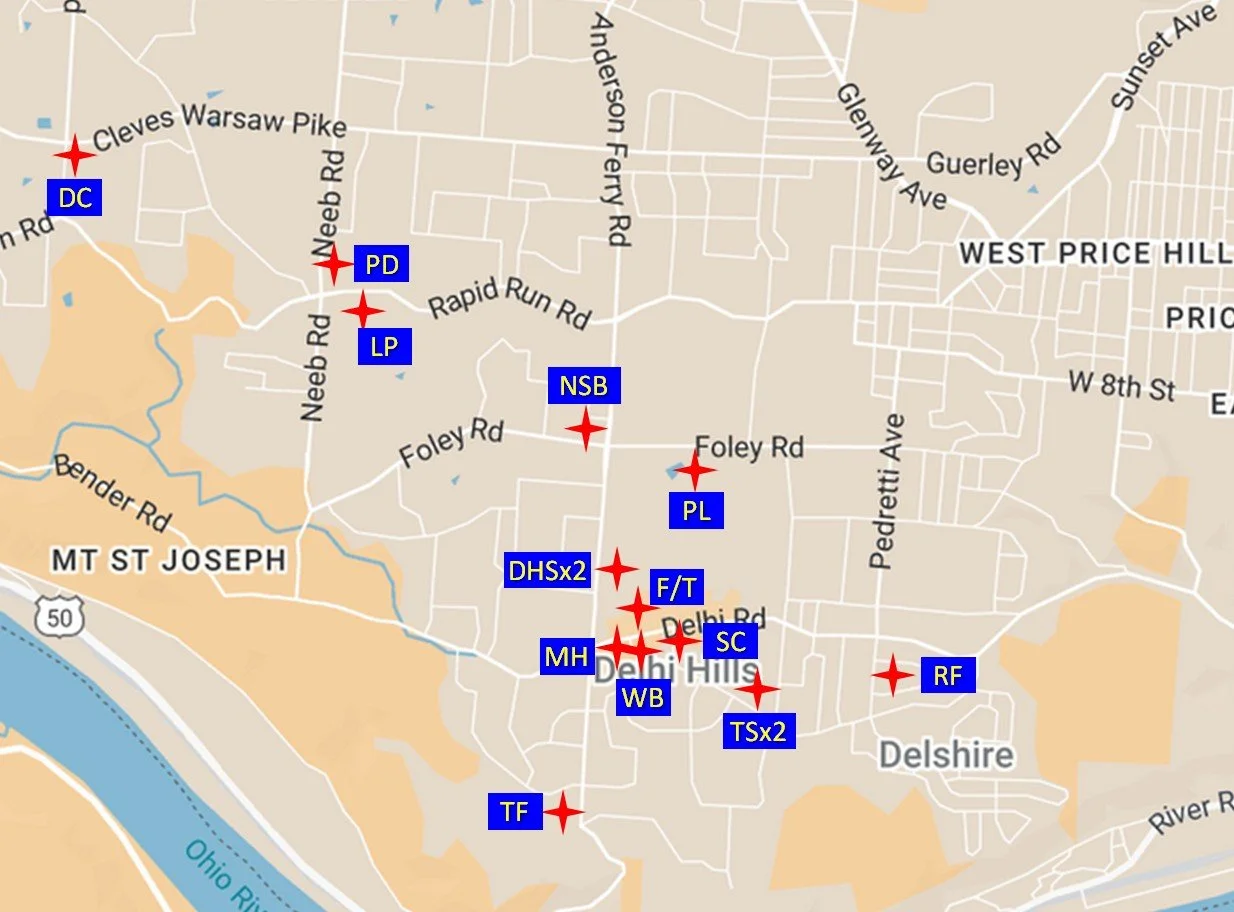 Use the map below to find portraits of 15 American patriots on display throughout Delhi Township. Red stars mark locations; blue squares give a hint to the exact spots. Enter each founder’s name and portrait location on the Find the Founders e-Passport. When you find all 15, submit your answers. You’ll receive a code by email. Bring your code to the Delhi Historical Society (during regular hours) to claim your prize!